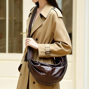 Genuine Leather Large Croissant Horn Bag Pleated Lightweight Design Zipper Closure Large Capacity Dumpling Crossbody